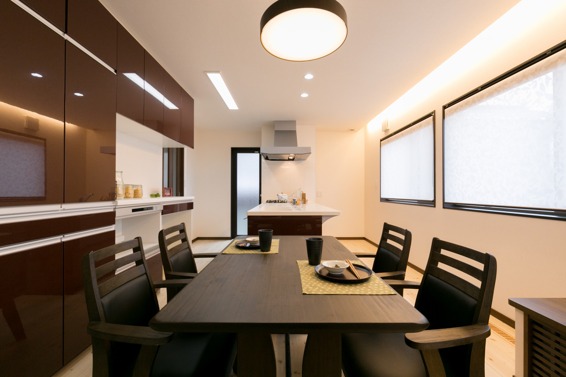 ダイニング、リビングと区切ることなく設けられたキッチンは話をしながら料理ができ、作り側、待つ側との距離を繋ぐ場所に。