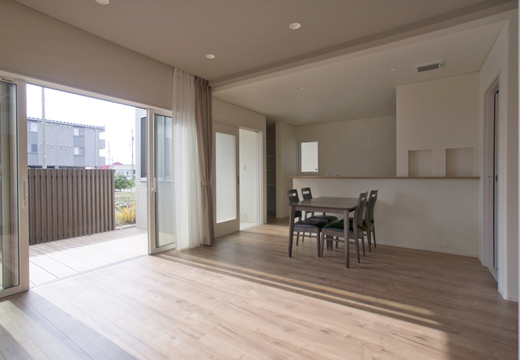 リビングと一体のウッドデッキのある、プライバシーを守る家