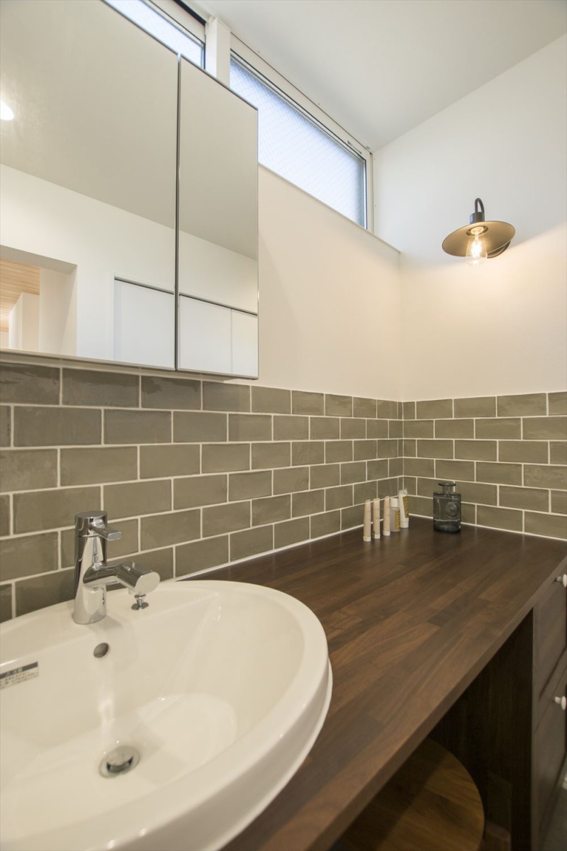 木製の洗面台を取り入れ、キッチンとの統一感を演出。