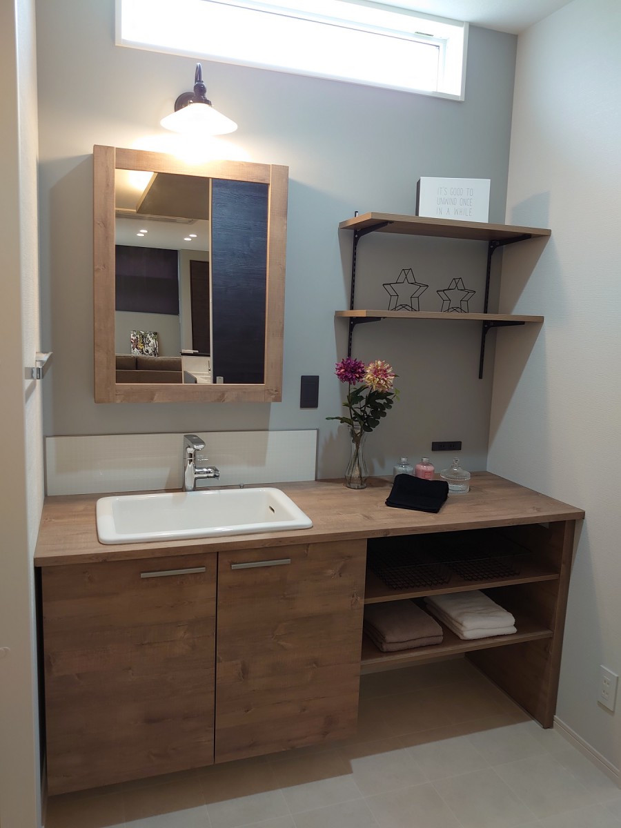 オシャレな照明器具と木目調に統一したレトロさを感じる洗面化粧台。