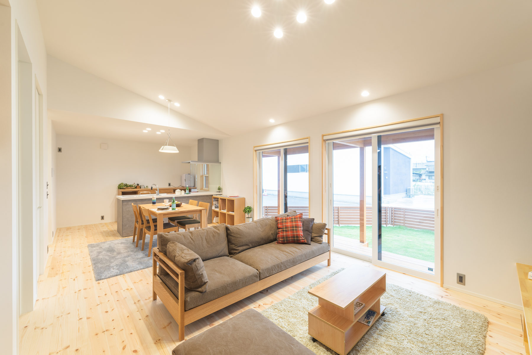 大きなウッドデッキに面した明るいリビングです。勾配天井になっており、開放感があります。