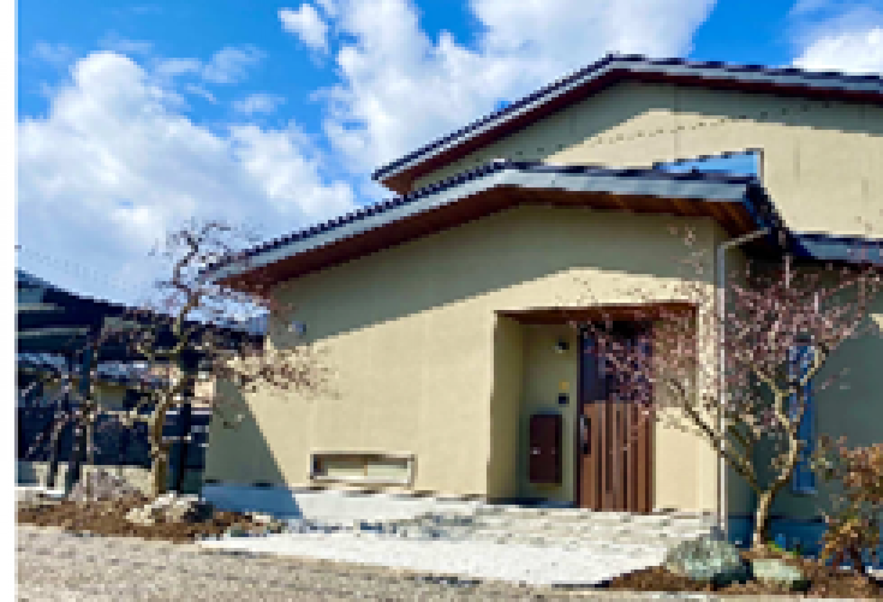 アイボリーの吹付塗装や洗い出し仕上げのポーチで、和テイストを取り入れ飽きのこないデザインに仕上げました。