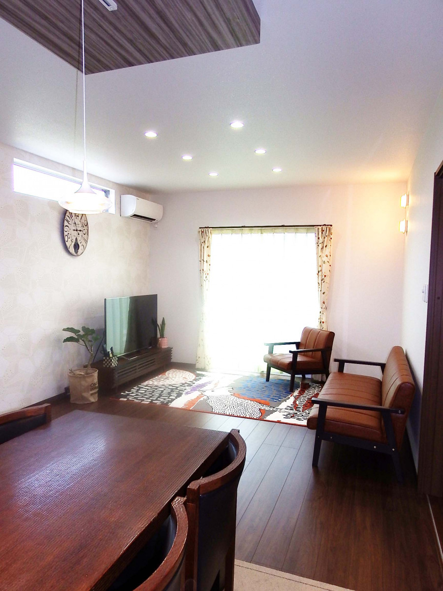 庭に面して掃き出し窓があり、庭でバーベキューをしたり、愛犬を遊ばせたりするのに行き来が便利。高窓から明るい光が降り注ぎ、日中は照明が要らないほどである。